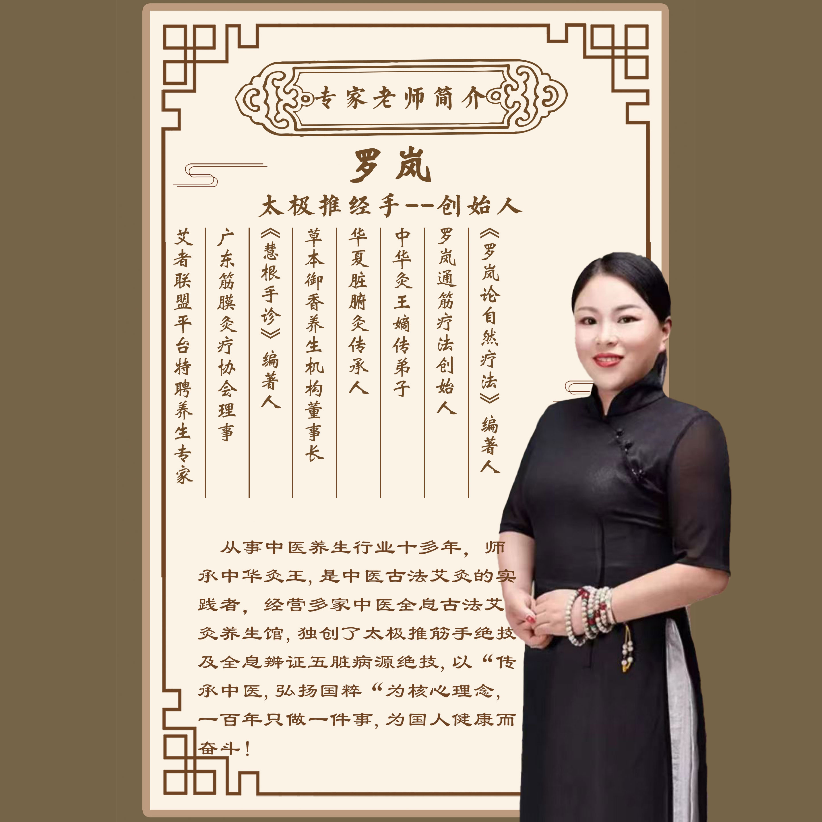 后记:专访结束后和罗岚老师单独聊天中有一句话令我特别震撼,老师说:“我罗岚一生只做一件事,为人类健康而奋斗,以“传承中医,弘扬国粹为毕生使命”。真的我是又震撼又感动,中医强,中国强,没有一个健康的身体,我们所有一切都将是镜中花,水中月而已,在此,我希望更多的人加入健康养生行业,也感谢有罗岚老师这样的实践者,原天下人身体健康,原我祖国繁荣昌盛!
